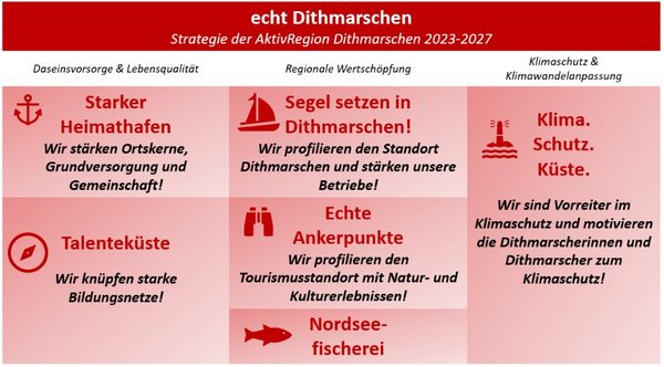 Für jedes Kernthema werden Ziele und Fördermaßnahmen festgelegt. Die Projektauswahl berücksichtigt den LEADER-Ansatz, Kriterien der integrierten nachhaltigen Entwicklung und die kernthemenspezifischen Ziele. Durch die Arbeitskreise und engen Abstimmungen auf Kreisebene ist die AktivRegion Dithmarschen gut in die überregionalen Prozesse eingebunden: